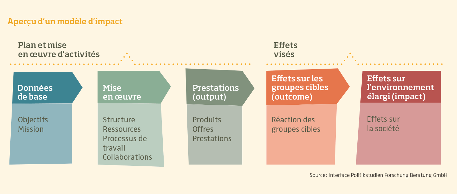 Un modèle d’impact est la représentation simplifiée de la manière dont une activité ou une mesure concrète peut influencer la société (avec quels moyens, quelles prestations). Le modèle d’impact met en place en règle générale une chaîne de relations « si…, alors… » : si telle ou telle mesure est prise, alors on suppose que la réalité change de telle ou telle façon.
